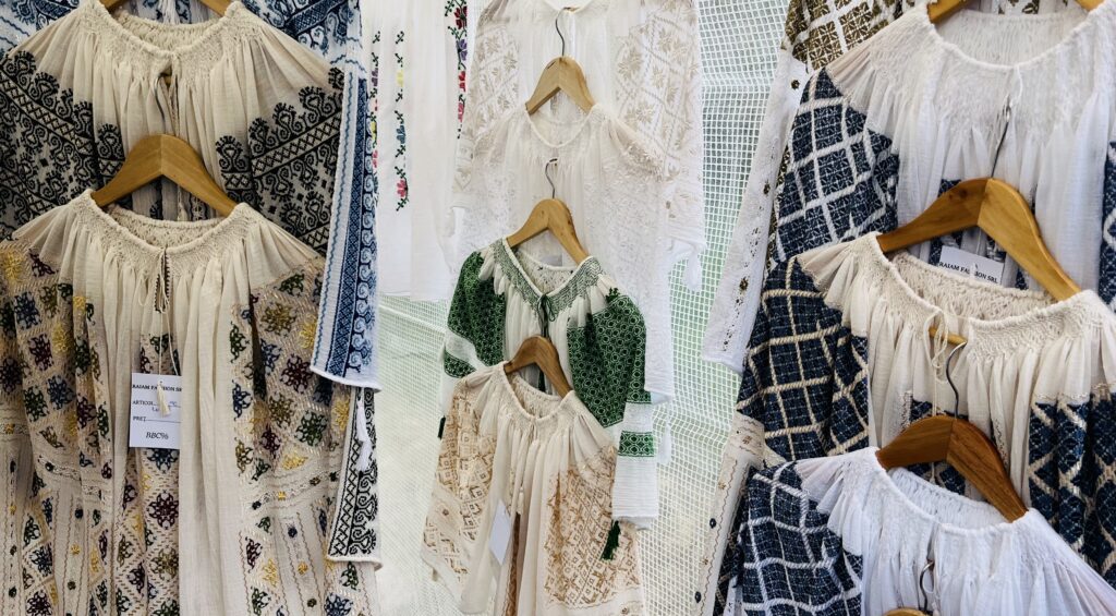 Și, bineînțeles, la un târg tradițional regăsim și ia românească. Doamna Cristina Stere se ocupă de un astfel de stand plin de cămăși brodate manual. „Nu le fac eu, ci o comunitate frumoasă de doamne din Breaza, județul Prahova. Eu doar le ajut să le vândă și să le aduc în față”, îmi explică ea.