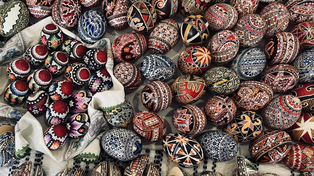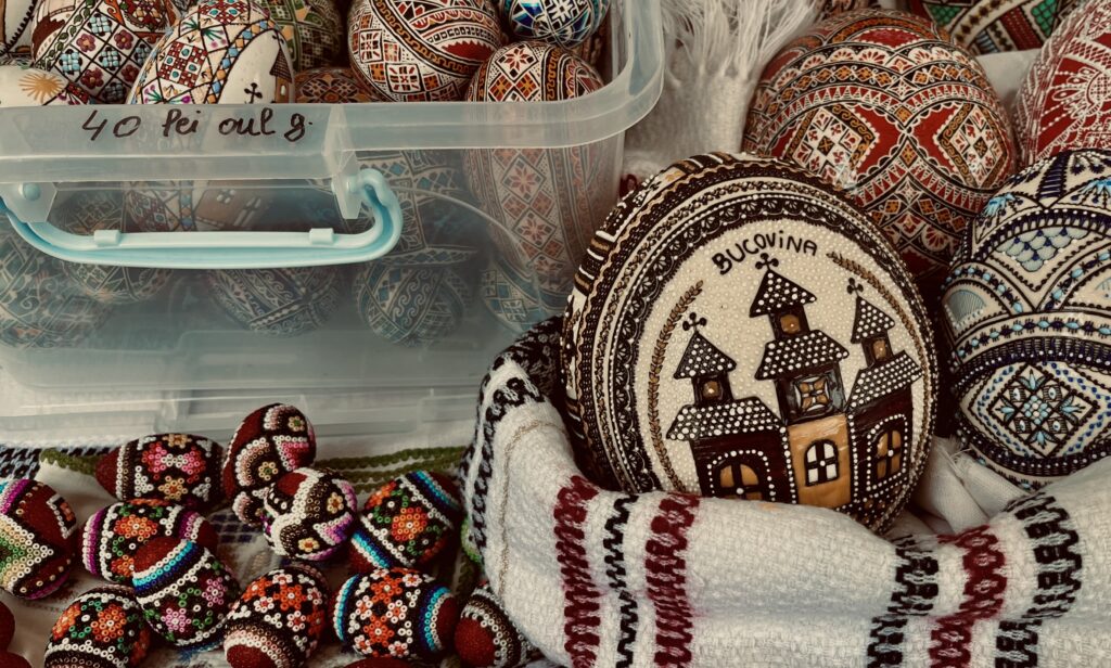 Chiar de la intrare, în stânga, o femeie din Bucovina își aranja ouăle încondeiate cu grijă. Nu sunt fragile, dar niciunul nu merită să stea în umbră. Fiecare dintre ele era așezat de către doamna cu basma ca într-o expoziție. Ea avea ouă de găină, de gâscă, unele decorate în tehnica tradițională cu ceară, altele îmbrăcate în mărgele fine sau în împletituri delicate. „Dumneavoastră le-ați făcut, nu?”, o întreb eu. „Da, da, eu le-am făcut, sunt modele tradiționale”, răspunde vânzătoarea. „Le-am făcut cum se face. Știu de la mama mea”, explică ea.