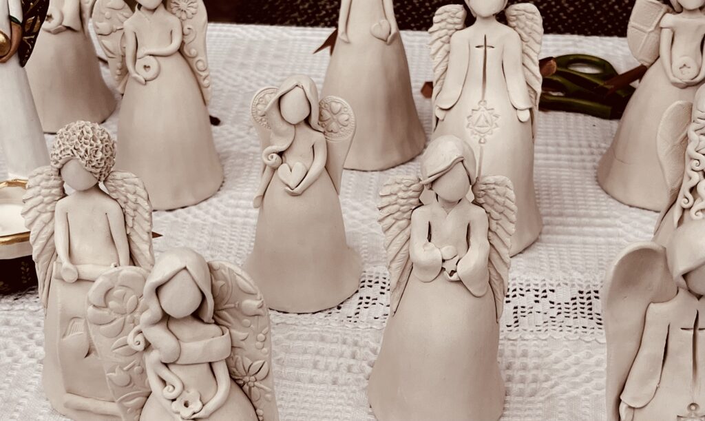 Puțin mai încolo, un alt îngeraș, cu aripi aurii, mi-a atras atenția. „Se numește Gabriel. Este mesager între Cer și Pământ, dar și protector al familiei. Este îngerul pe care Dumnezeu îl trimite nu doar ca mesager să ne transmită tot felul de vești și mesaje în viața noastră, ci și să ne ajute să aflăm propriile daruri și potențialuri. Și Gabriel este una dintre prezențele cele mai des întâlnite și în Vechiul și în Noul Testament, ca mesager între Cer și Pământ, ca putere a lui Dumnezeu. Gabriel este cel care a ocrotit-o pe Fecioara Maria de la momentul Bunei Vestiri și în toate momentele în care era de nevoie”, îmi explică artista.