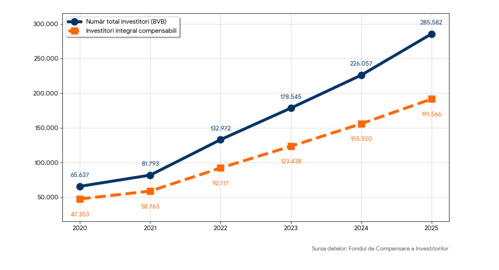 Cele două evenimente recente relevă un interes în creștere al investitorilor de retail de pe Bursa de Valori București, care au devenit tot mai numeroși. Efectivul lor s-a majorat cu 26,3% în ultimul an, ajungând la aproape 285.600. Ceea ce înseamnă de peste patru ori mai mult decât în 2020, potrivit datelor Fondului de Compensare a Investitorilor (FCI). Dintre aceștia, investitorii compensabili integral – cu plafoane de investiții sub 20.000 de euro – reprezentau mai mult de două treimi (67%). Numărul micilor investitori a avansat și el în 2025 cu aproape 23%, și a ajuns de patru ori mai mare decât cel din 2020.