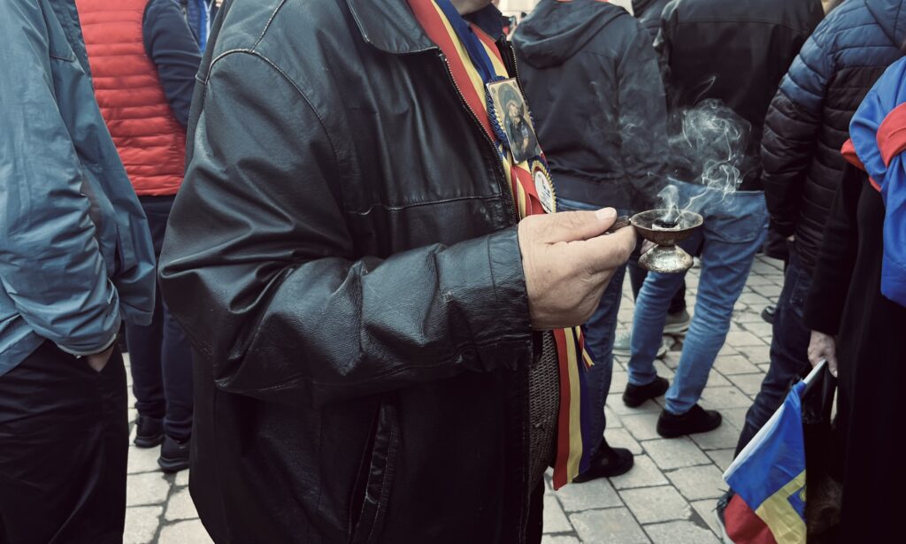 La un moment dat, aerul din fața CNA se modifică. Mirosul nu mai e unul al florilor de primăvară și nici al fumului de țigară, ci de tămâie. Un bărbat în vârstă, cu tricolorul aruncat pe după gât și o icoană prinsă la piept, se plimbă printre oameni cu un cățui aprins. Murmură rugăciuni și pare că vrea să „sfințească” protestul.