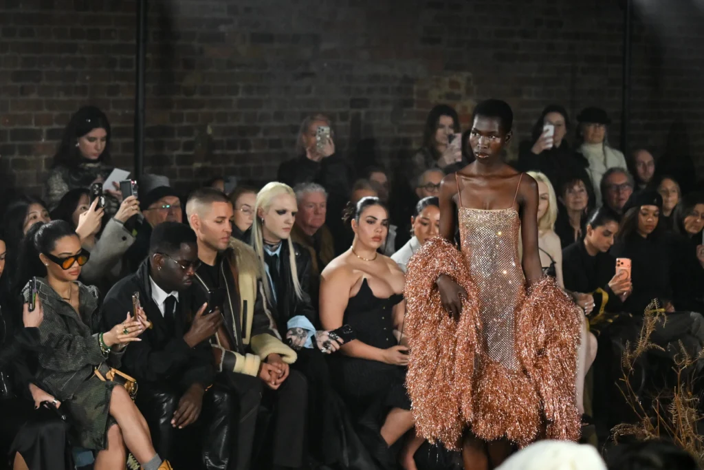 Există dramă ce poate fi observată și în afara podiumului. Apariția de ultim moment a unui singur fotoliu cu o pernă de mătase printre băncile de lemn a anunțat o vizită surpriză a Regelui Charles. Publicul designerului britanico-nigerian Tolu Coker, printre care s-a regăsit și colega sa designer Stella McCartney și rapperii Skepta și Little Simz, a fost rugat să stea în picioare la intrarea monarhului, care părea să se bucure de distragerea atenției de la titlurile de știri despre arestarea fratelui său.