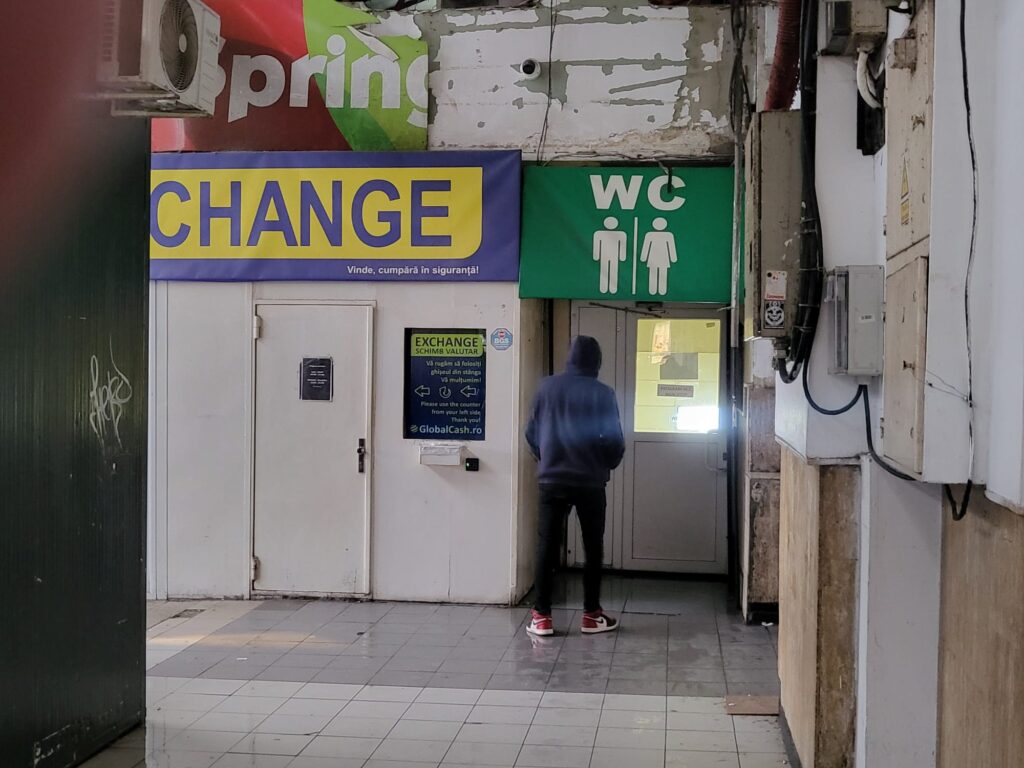 Antreprenorul nu mai are hamali, dar de ani de zile administrează WC-urile din Gara de Nord. Și acum chiar are o poziție liberă: femeie de servici, conform afișului. Deci, nu femeie de serviciu, ci de servici, că așa s-o zice în farsi.