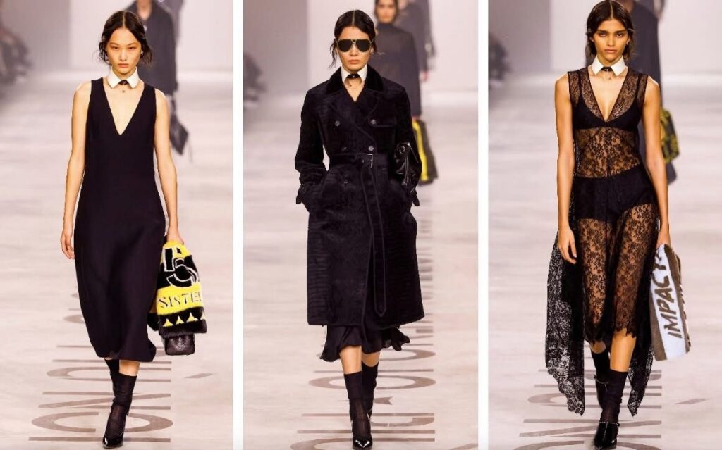 Spiritul radical și revigorant pe care Lagerfeld l-a adus casei de modă a revenit pe podiumul de aici. Rochiile de seară erau purtate cu gulere albe apretate, în stilul lui Karl, și nu cu coliere strălucitoare. Eșarfele în dungi imprimate cu sloganul „5 SISTERS” declarau loialitatea față de familia Fendi, în stilul teraselor.