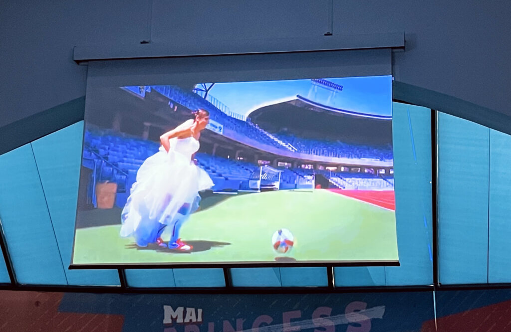 Imaginile care au stârnit cele mai multe reacții în sală au fost însă altele. Florentina, în rochie de mireasă, încălțată cu pantofi sport și jambiere, pe teren. Ea prezenta imagini de la nunta sa. În loc de buchet, ținea mingea de fotbal. Fotografiile o surprind cum dă pase cu piciorul, apoi cu capul, în ziua nunții sale, cu lejeritate. Căci tocmai asta o face fericită.