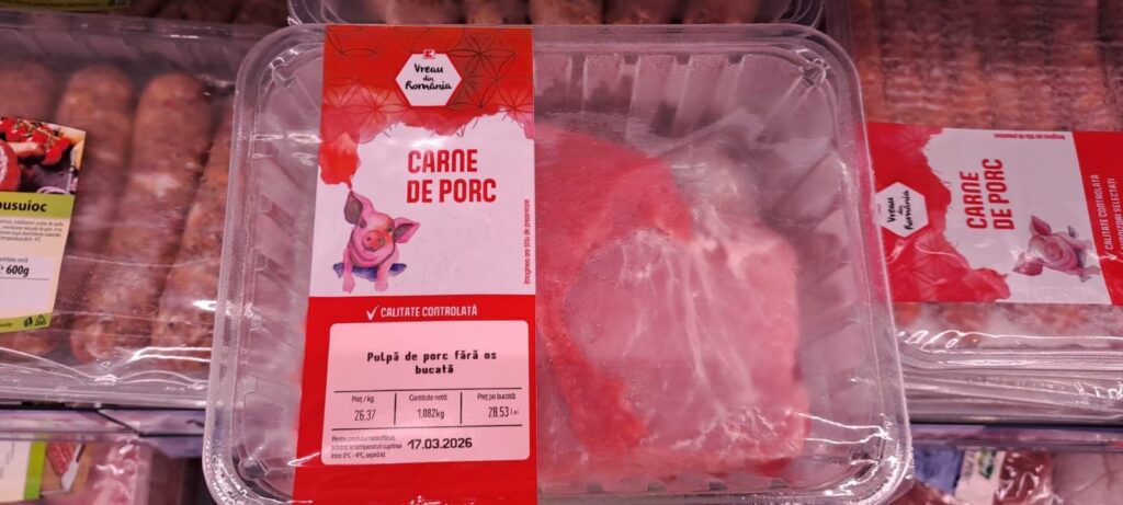 Pe rafturi am găsit multă carne de porc, țara de proveniență: Spania – aproape de termenul de expirare – și foarte puțină carne românească, la prețuri mai mari decât cea de import.
