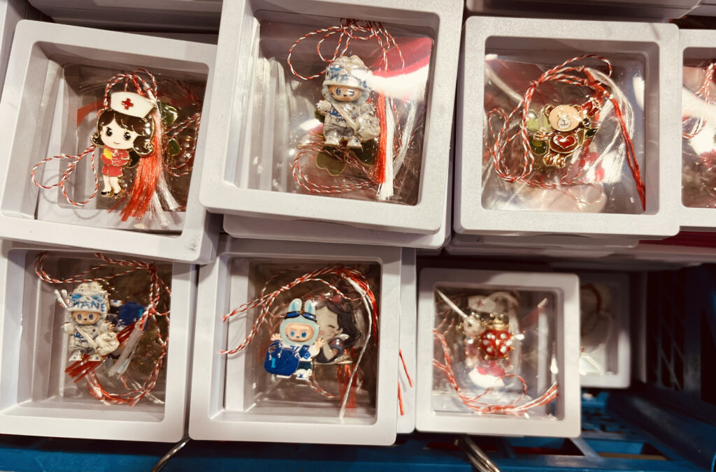 „Alegeți cu încredere, doamnă. Am aici cele mai frumoase modele, cele mai deosebite, marfă de calitate”, își laudă produsele o altă vânzătoare printre trecători. La standul ei, printre mărțișoarele cu care suntem obișnuiți, apare și celebrul Labubu, de data aceasta sub formă de brățară. Și-a pierdut din prestanță personajul care, nu demult, costa câteva sute de lei bucata. Acum a ajuns la doi lei, prins într-un șnur alb-roșu.