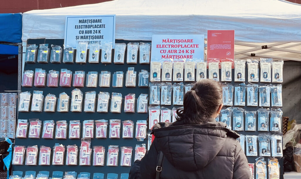 Afară, la câțiva pași de hală, o domnișoară și-a aranjat pe masă lănțișoarele aurii, clasicele modele „Versace”. Iar lângă ele, stau proptite tablouri primăvăratice făcute cu inteligență artificială, acele desene animate care au împânzit TikTokul, în culori saturate, cu chipuri perfecte. E o combinație între lux italian și algoritm de ultimă generație.