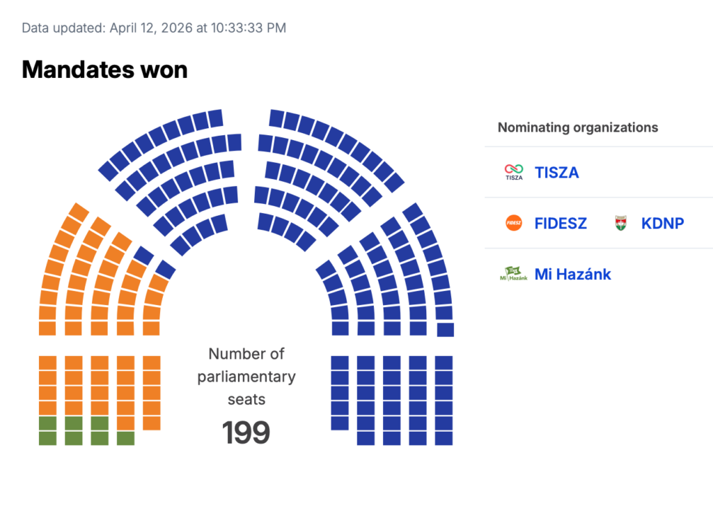 Potrivit Biroului Electoral Național al Ungariei, după numărarea a 67% din voturi, Tisza, partid condus de Peter Magyar, este în frunte cu 137 de mandate, urmat de Fidesz, partid condus de Viktor Orban, care are împreună cu KDNP 55 de mandate.